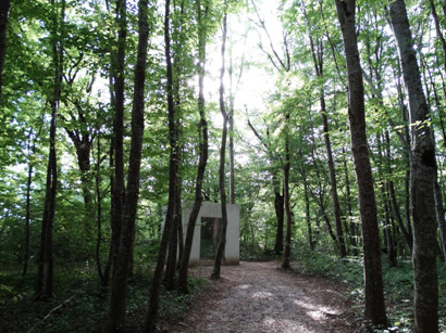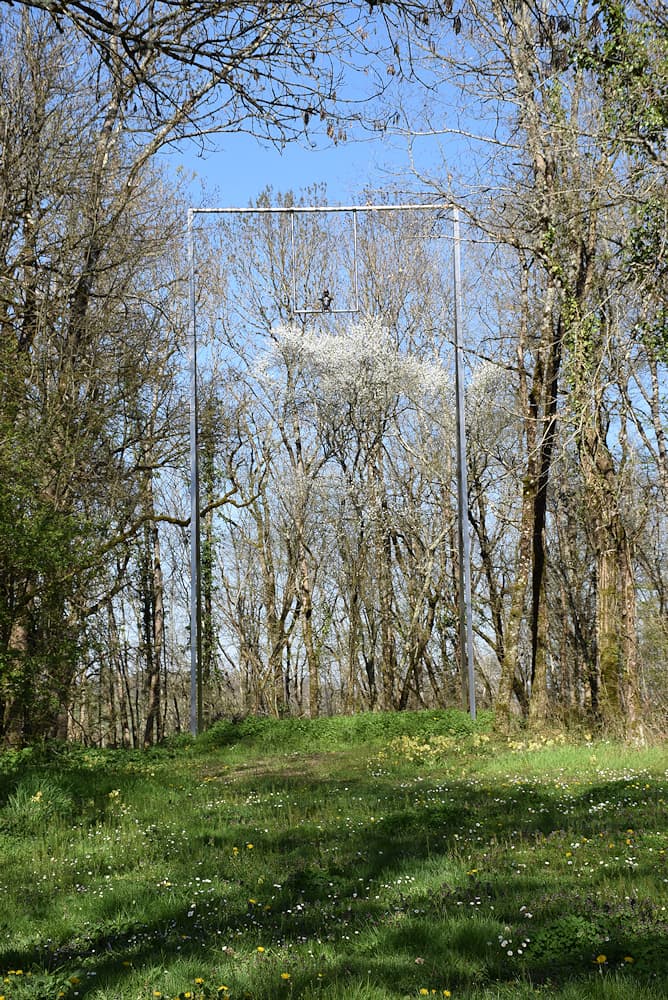 Dans les sous-bois de Châteaubrun, un édicule clos dont les trois portes sont des miroirs d’acier.
