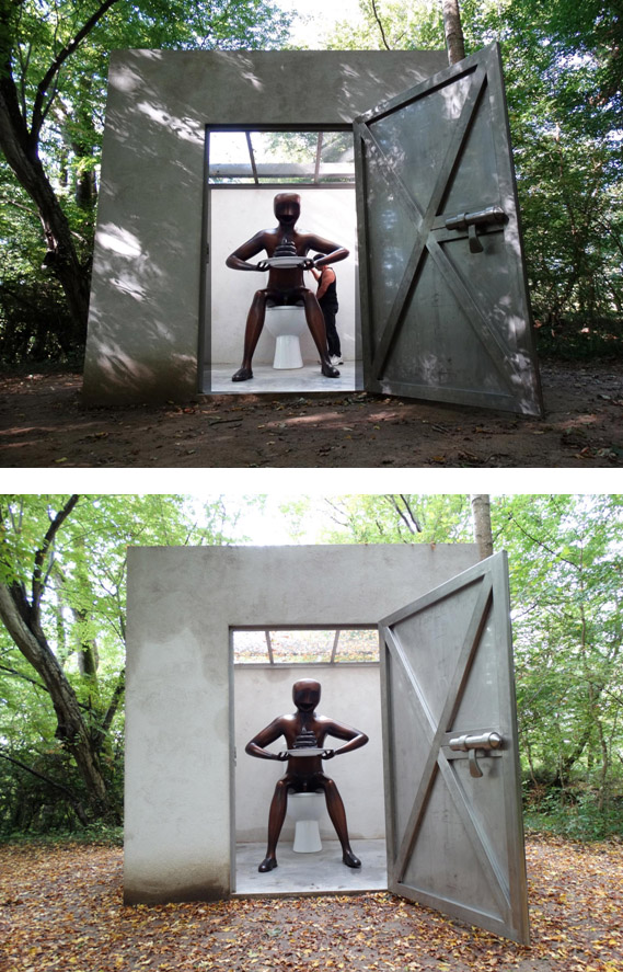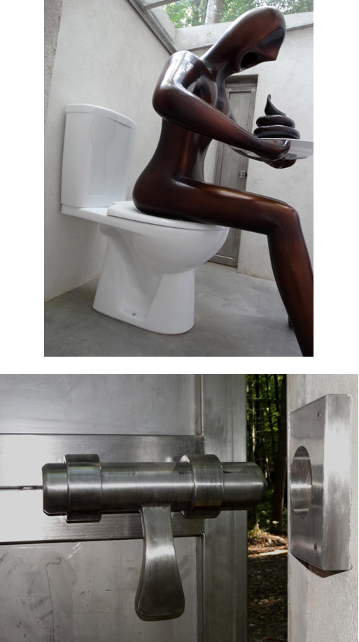 A l’intérieur de l’édicule, une sculpture : un coprophage, bouche ouverte en position de déféquer sur un bloc WC, dans ses mains une immense assiette, avec en son centre, un étron.